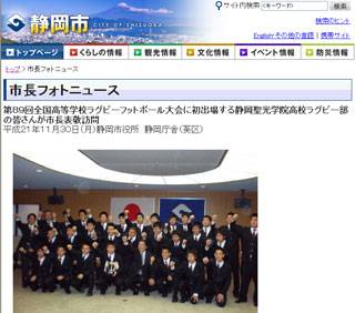 花園出場を決めた聖光スティンガーズが去る11月30日に、ご自身も静岡高校ラグビー部出身であり熱心なラグビーファンとしても知られる小嶋善吉静岡市長を表敬訪問した際の記事が静岡市役所ホームページ【市長フォトニュース】に掲載されました。
