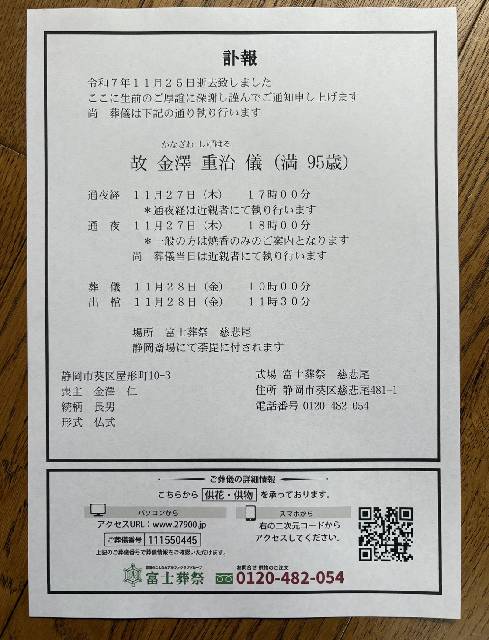 7期卒業生金澤仁さんの御尊父の訃報を通知します 金澤重治儀(満 95歳) 令和7年11月25日逝去致しました ここに生前のご厚誼に深謝し謹んでご通知申し上げます